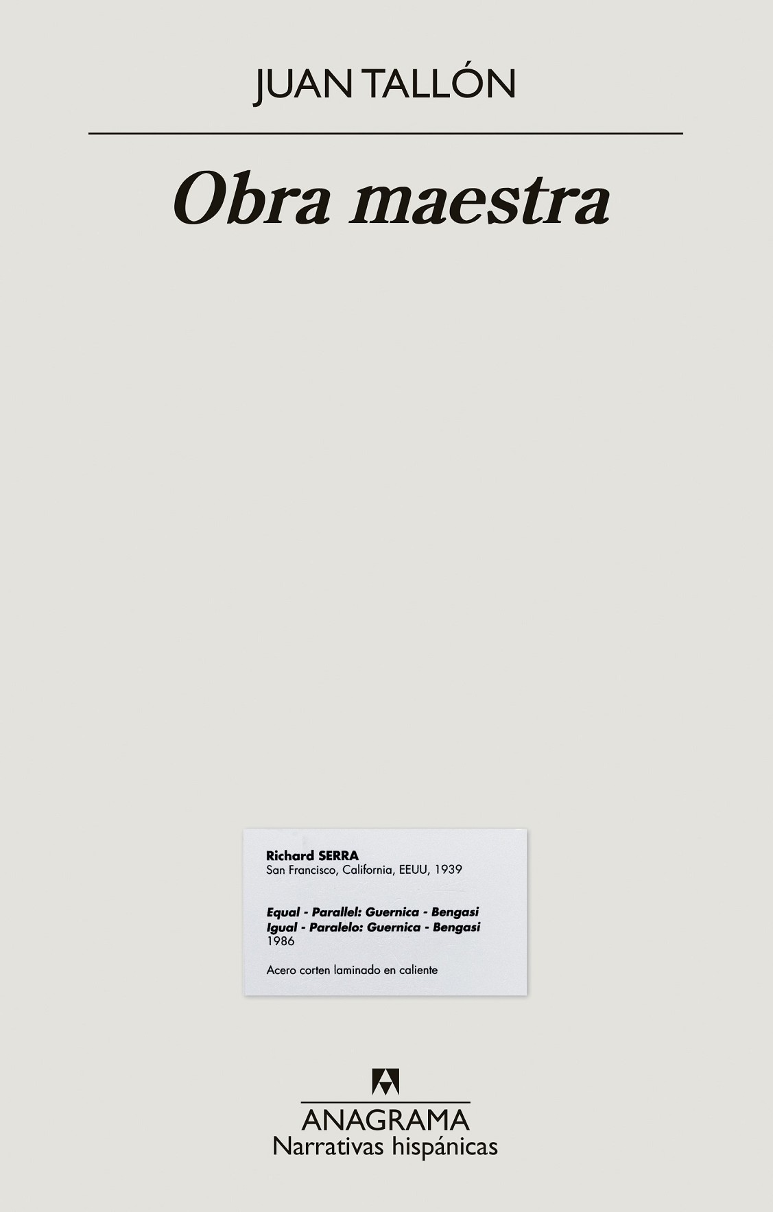 La misteriosa desaparición queda elevada también a categoría de obra maestra. Como el escándalo adquiere resonancia mundial, Serra acepta replicar la pieza y darle rango de original, y el Reina Sofía, sumarla a su exposición permanente. Entre la novela de no ficción y la crónica novelada, entre el disparate y lo alucinógeno, Obra maestra reconstruye a ritmo de thriller trepidante un caso que lleva a hacerse algunas preguntas perturbadoras: ¿cómo es posible que algo así sucediera? ¿Cómo se convierte en original una copia? ¿Qué es arte en el arte contemporáneo? ¿Cuál fue el verdadero destino de la famosa, enorme y pesada escultura de acero convertida en aire? ¿Es posible que un día aparezca?