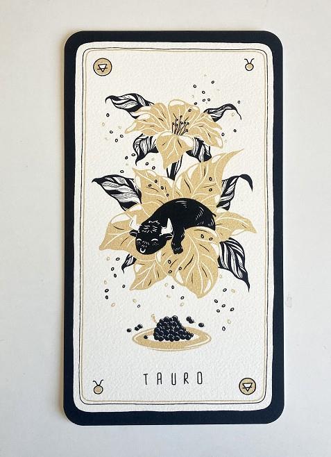 Làmina serigrafiada dels 12 signes zoodiacals. A dues cares, 11x22cm, impresa a mà a dos tintes en paper 100% cotó 290g.